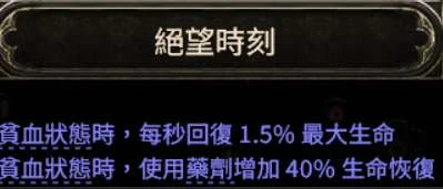 理论可行但没有亲自测过,具体是透过天赋绝望时刻搭配死亡之声,再加上其他回血手段,让血量卡在贫血线。而且技能要有一些血量消耗,保证攻击的时候血量会低于贫血线。