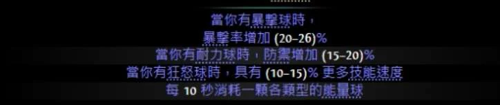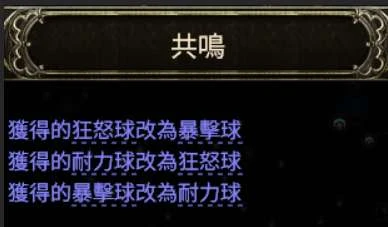 不过目前这样有点尴尬,因为刷图和打王都需要暴击球,而最需要频繁拿的是狂怒球,毕竟电矛会消耗。耐力球则是稍微增加刷图安全性就好。刚好透过共鸣这个关键天赋,可以把球改成各自需要的情境,适配不同场景。