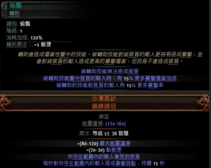 巫妖的暴率问题比较大,因为缚舌攻击会耗血,巫妖流没办法用。我是临时搞了一把稀有长矛来用,然后透过偷袭辅助搭配天赋里对致盲敌人增加暴率的效果,再用沙瀑面纱来常驻致盲,虽然暴击弱点没时间叠可以当没有,但这样在天赋允许的范围里也能达到百暴。